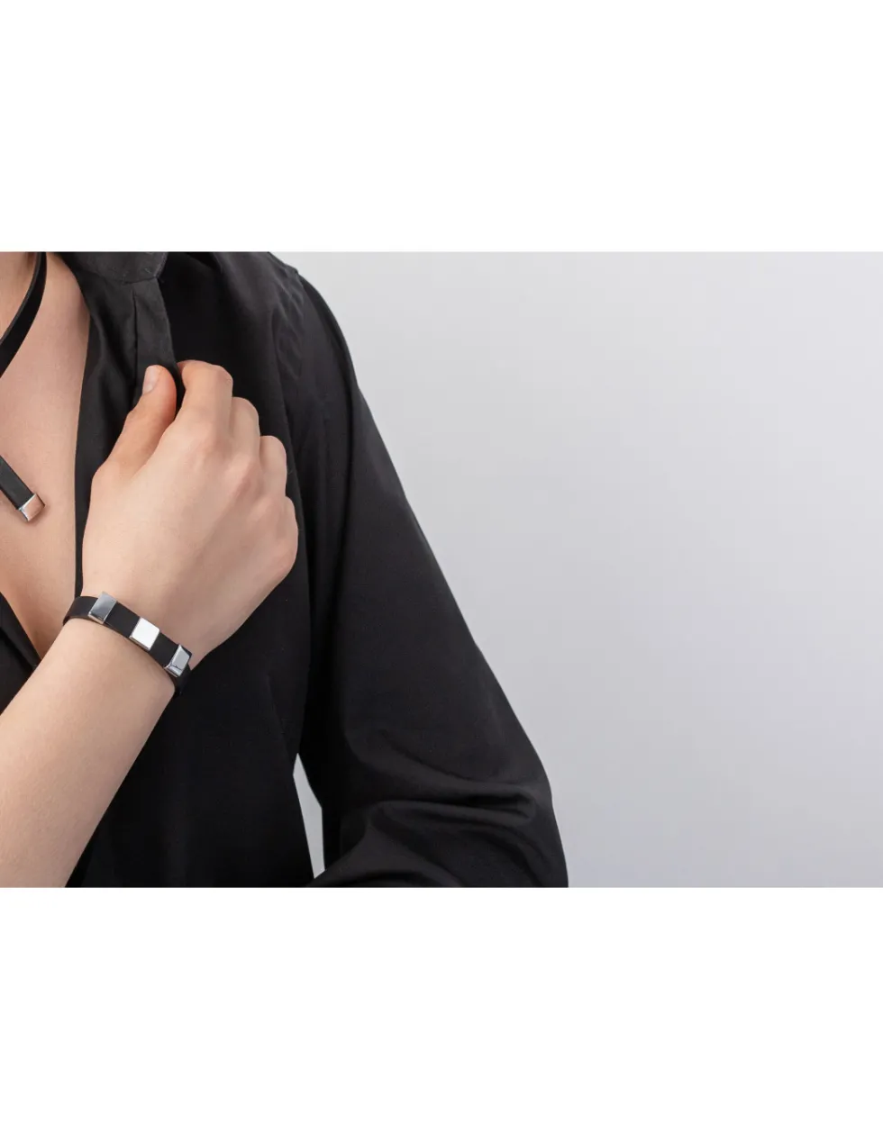 Prosta, a zarazem nowoczesna bransoleta ze skóry naturalnej oraz stali w kolorze błyszczącym.