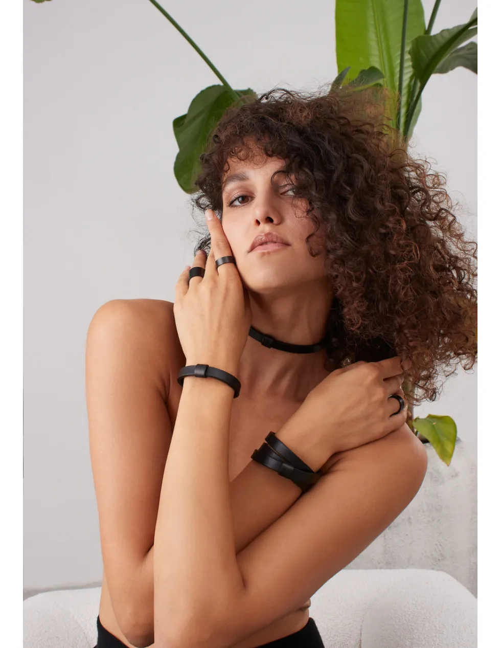 Prosta i ponadczasowa bransoleta skórzana z czarnym matowym elementem ze stali szlachetnej.