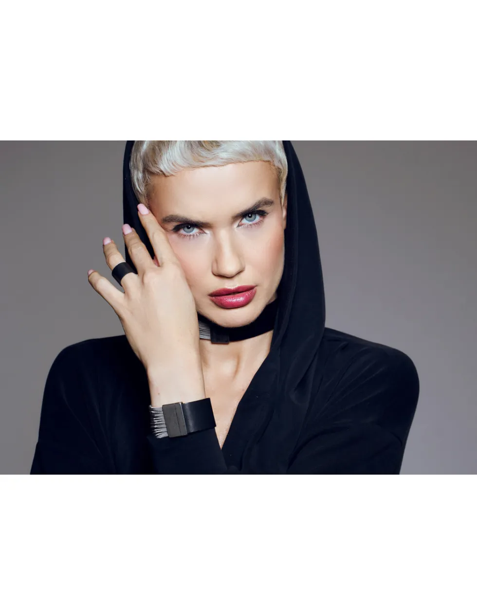 Naszyjnik typu choker wykonany z najwyższej jakości stali szlachetnej, skóry oraz siatki stalowej.