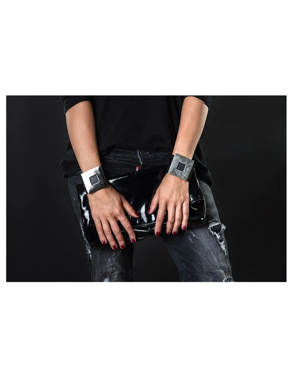 Moora Czarna szeroka bransoleta ze skóry oraz stali z błyszczącym kwadratem* Bransolety