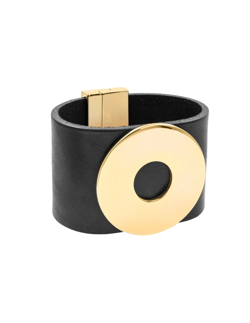 Moora Czarna szeroka bransoleta ze skóry z pozłacanym elementem* Bransolety