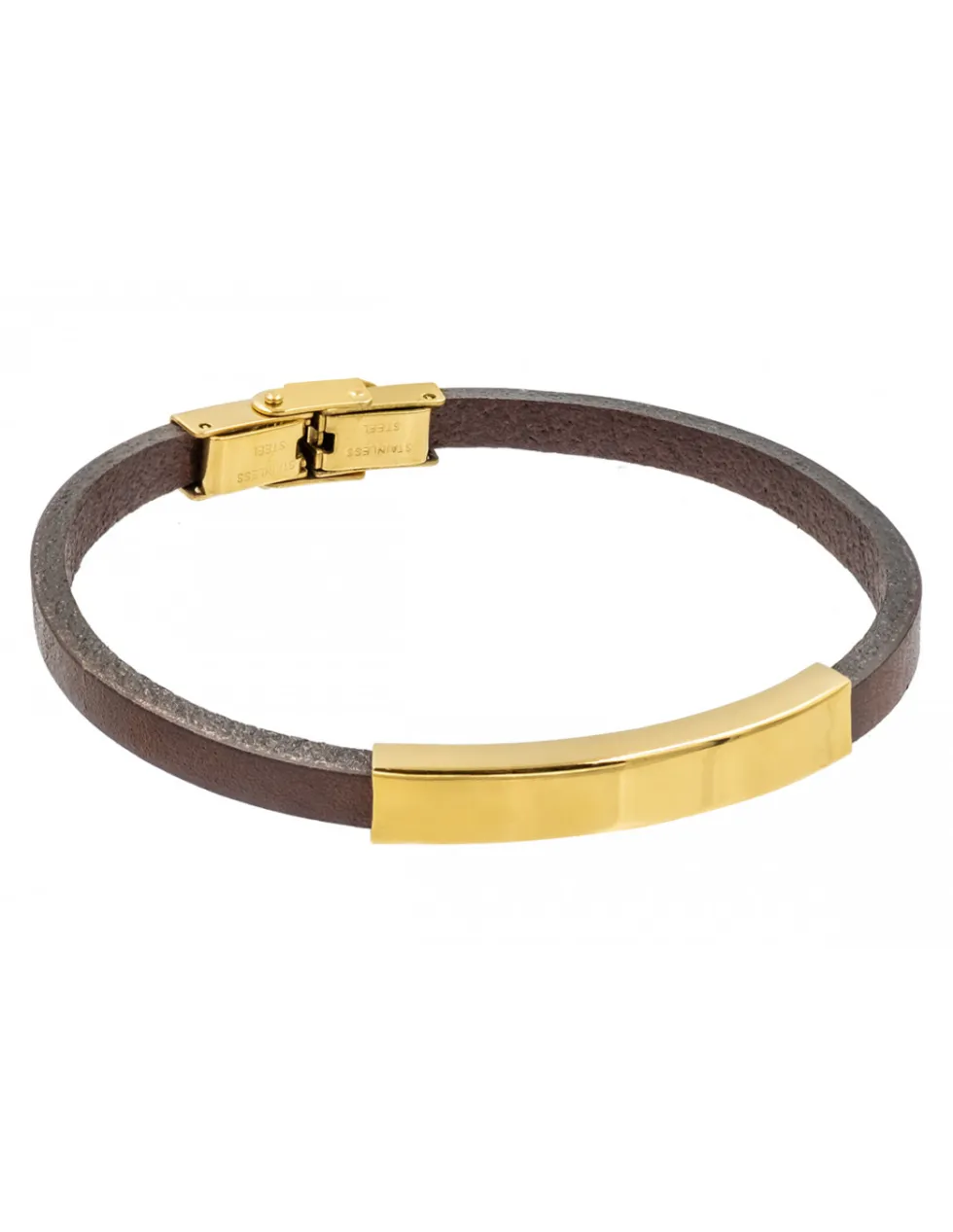 Prosta, nowoczesna bransoleta ze skóry oraz stali szlachetnej pozłacanej.Możliwość wykonania graweru na elemencie s…