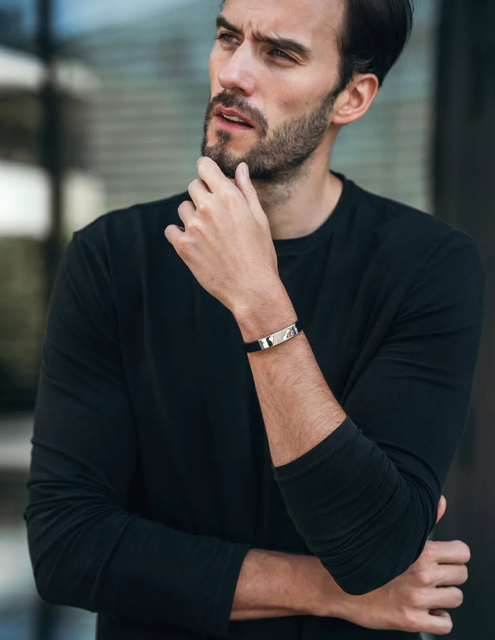 Prosta, nowoczesna bransoleta ze skóry oraz stali. Możliwość wykonania graweru na elemencie stalowym.
