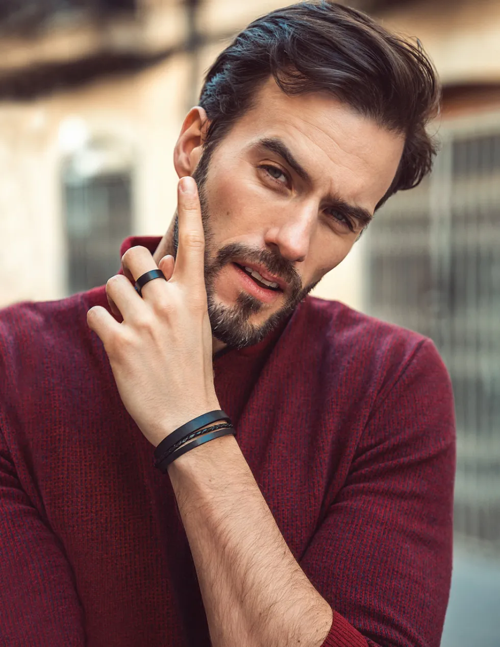 Bransolety w połączeniu z naturalną czarną skórą oraz naturalnym kamieniem tworzą idealny zestaw.