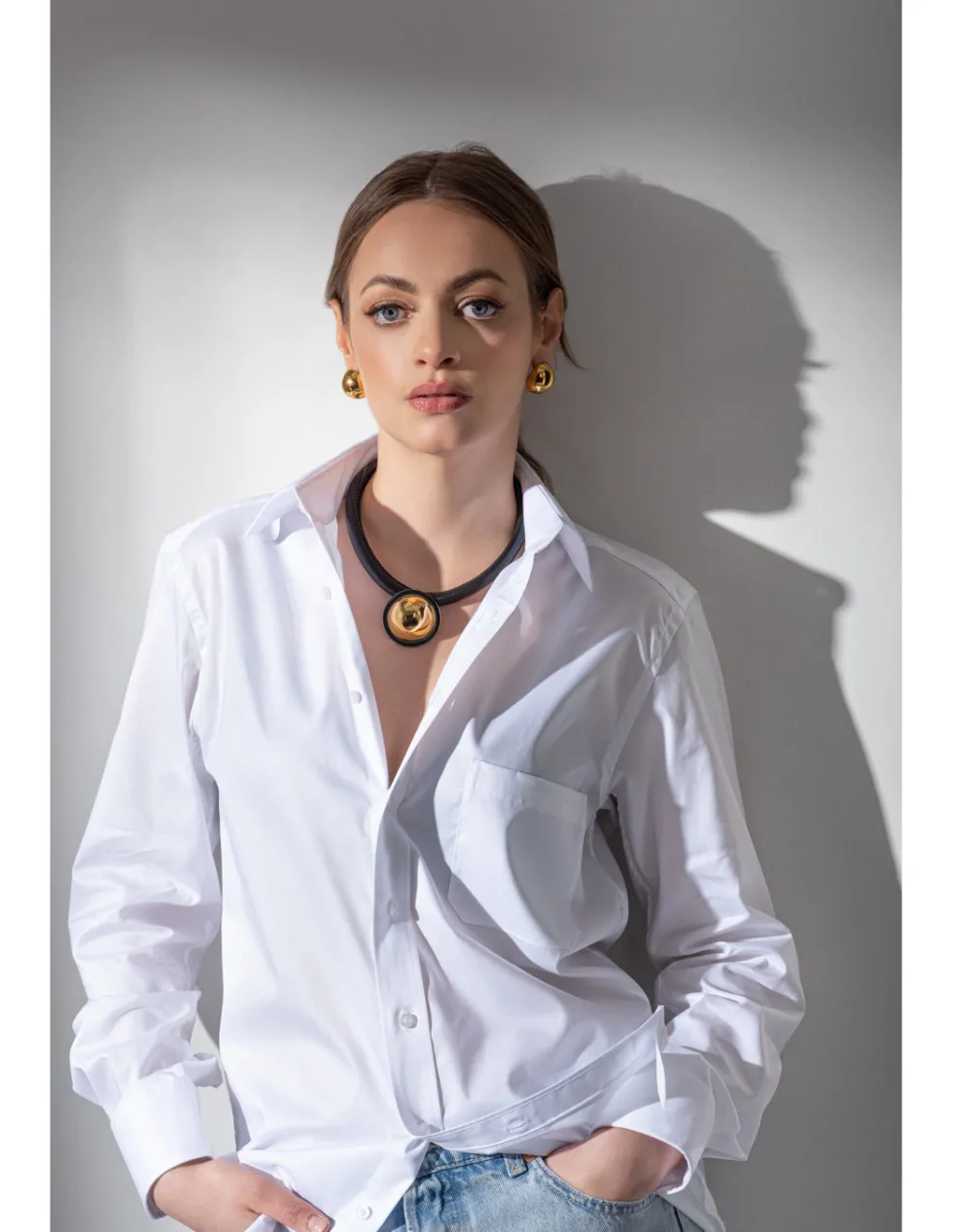 Nowoczesny, prosty i ponadczasowy naszyjnik z miękkiej, ręcznie szytej skóry oraz stali.