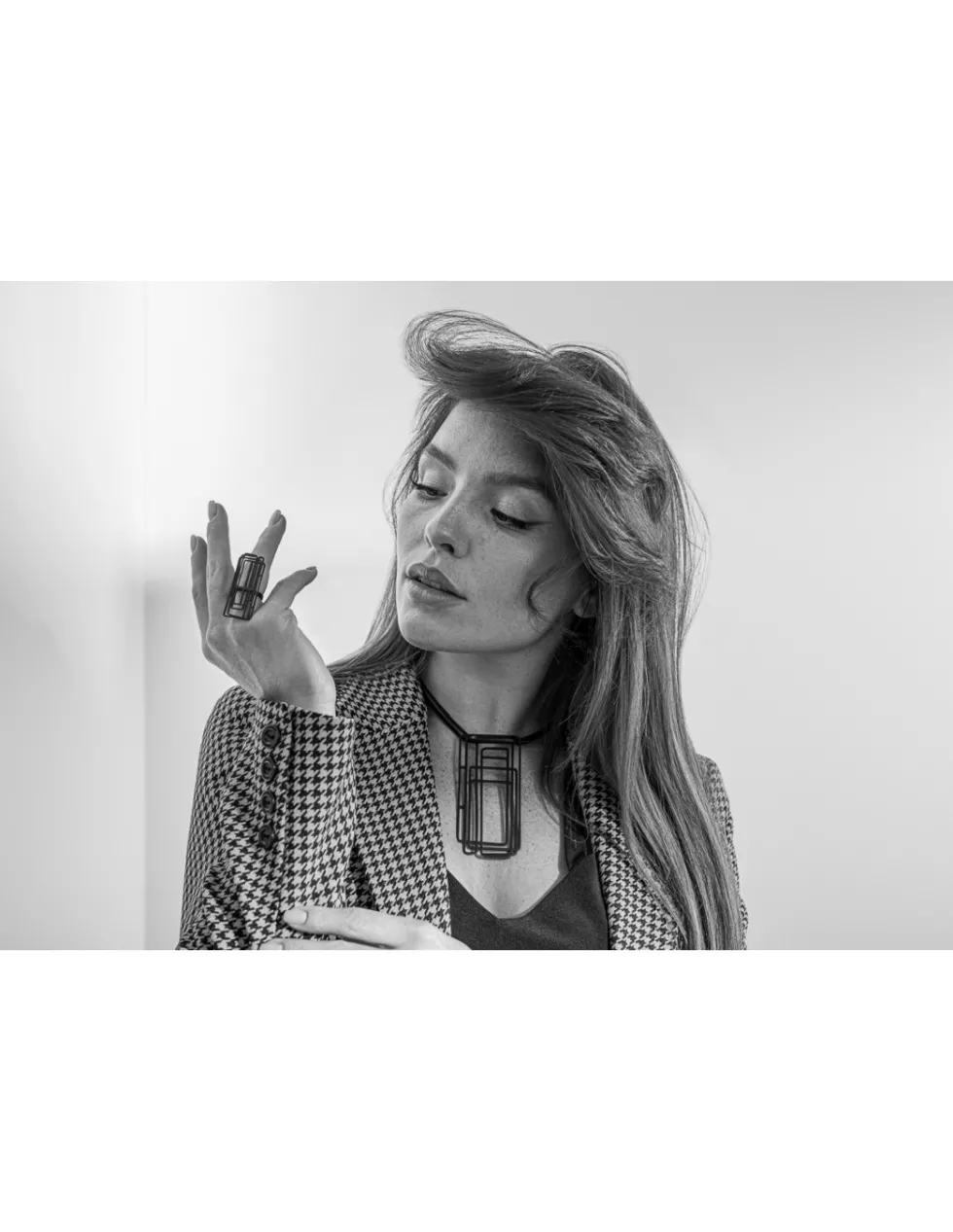 Świetnie sprawdza się zarówno w stylizacji sportowej, jak i wieczorowej. Naszyjnik pięknie komponuje się z pierścionkiem o tym samym wzorze.