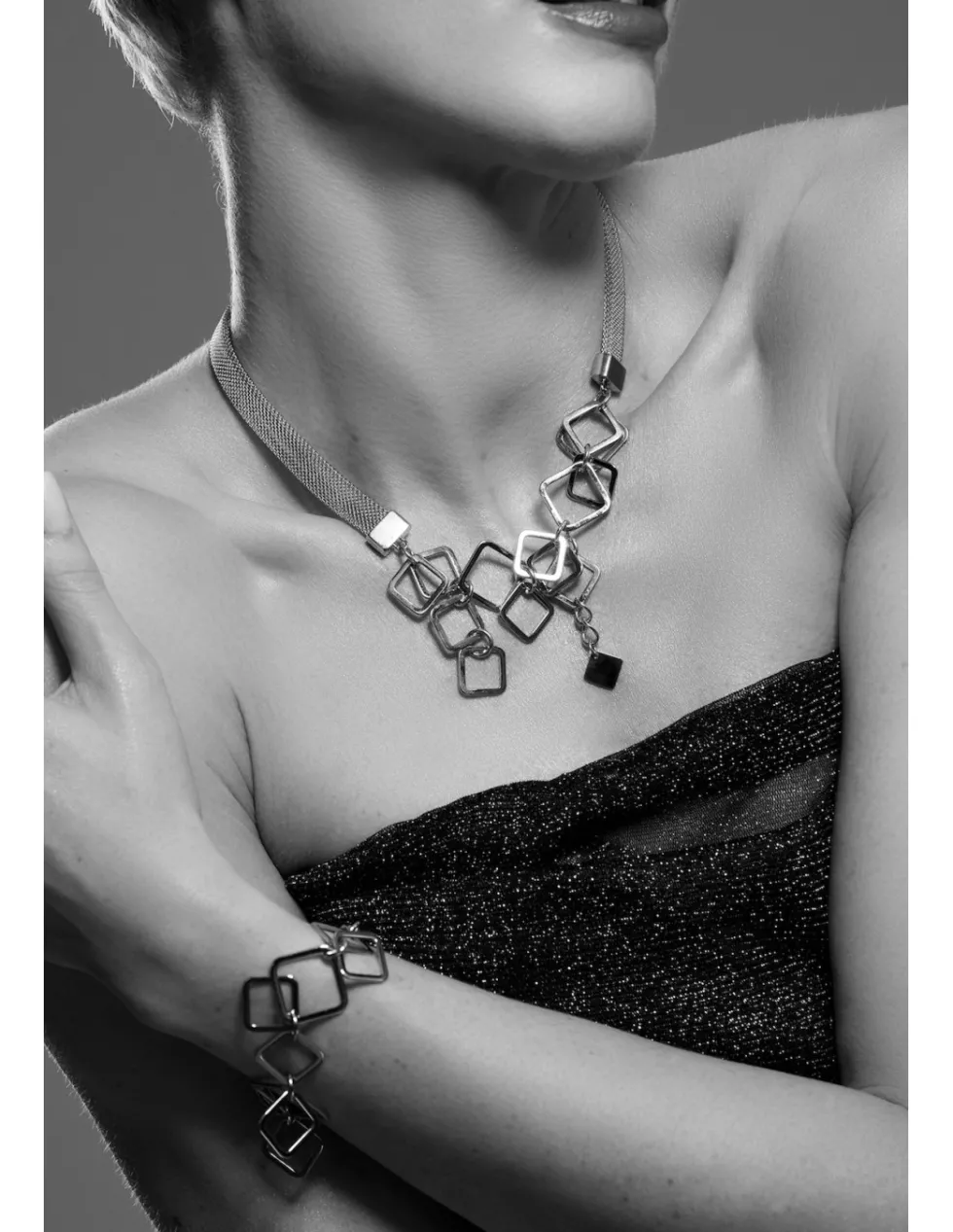 Prosty, delikatny i nowoczesny naszyjnik z najwyższej jakości stali szlachetnej z ruchomymi elementami w formie kwadratów.
