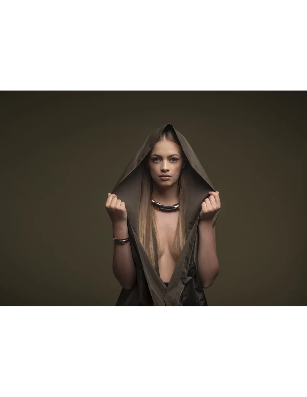 Nowoczesny naszyjnik wykonany z szytego miękkiego skórzanego rzemienia , wypełnionego bawełnianym rdzeniem. Produkt stanowi idealne