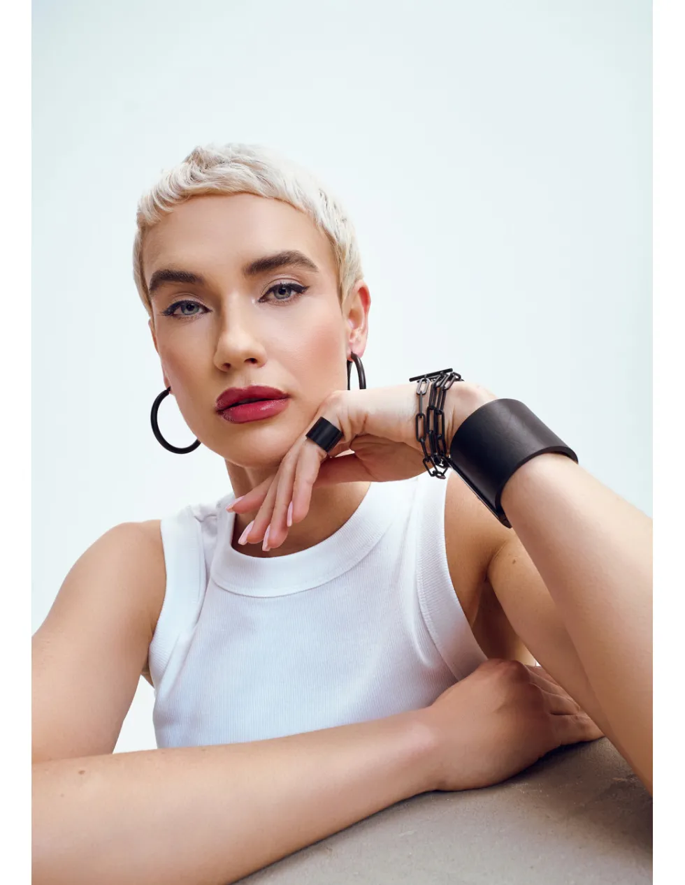 Bransoleta z czarnej stali szlachetnej owijana na ręce 3 razy.