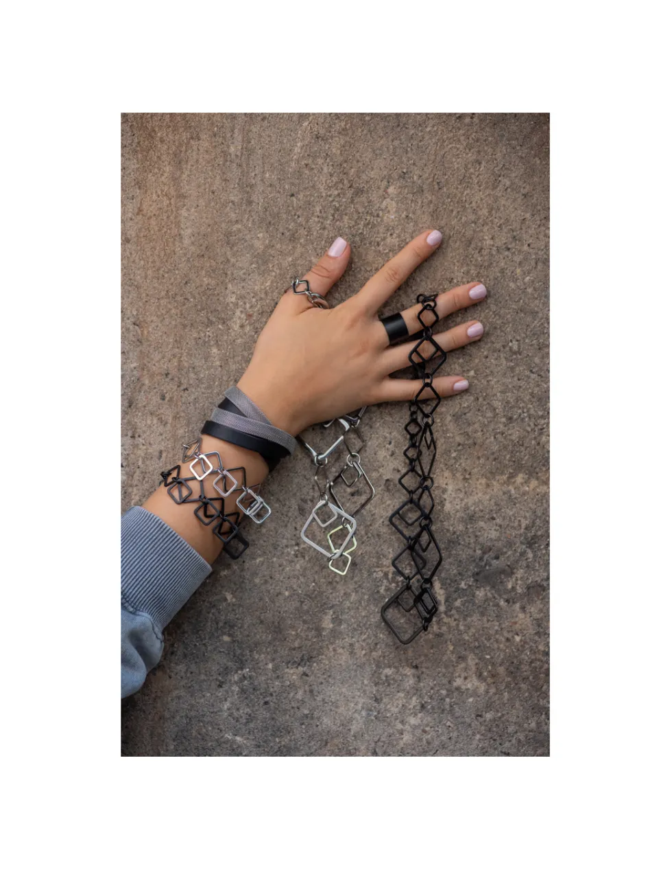 Prosty i nowoczesny naszyjnik 3d z czarnej matowej stali szlachetnej/chirurgicznej. Elementy są ruchome.