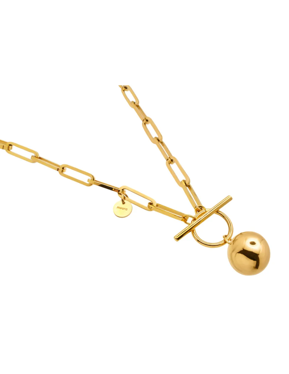 Krótki naszyjnik z ozdobną kulą i oryginalnym zapięciem. Wykonany z pozłacanej stali szlachetnej najwyższej jakości.