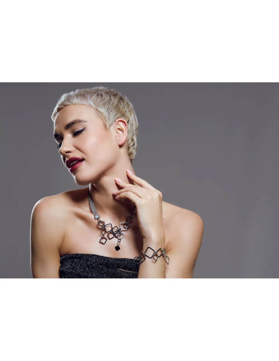 Przepiękny i nowoczesny naszyjnik ze stali szlachetnej. Idealne połączenie siatki stalowej ze stalą szlachetną w formie kwadratów.