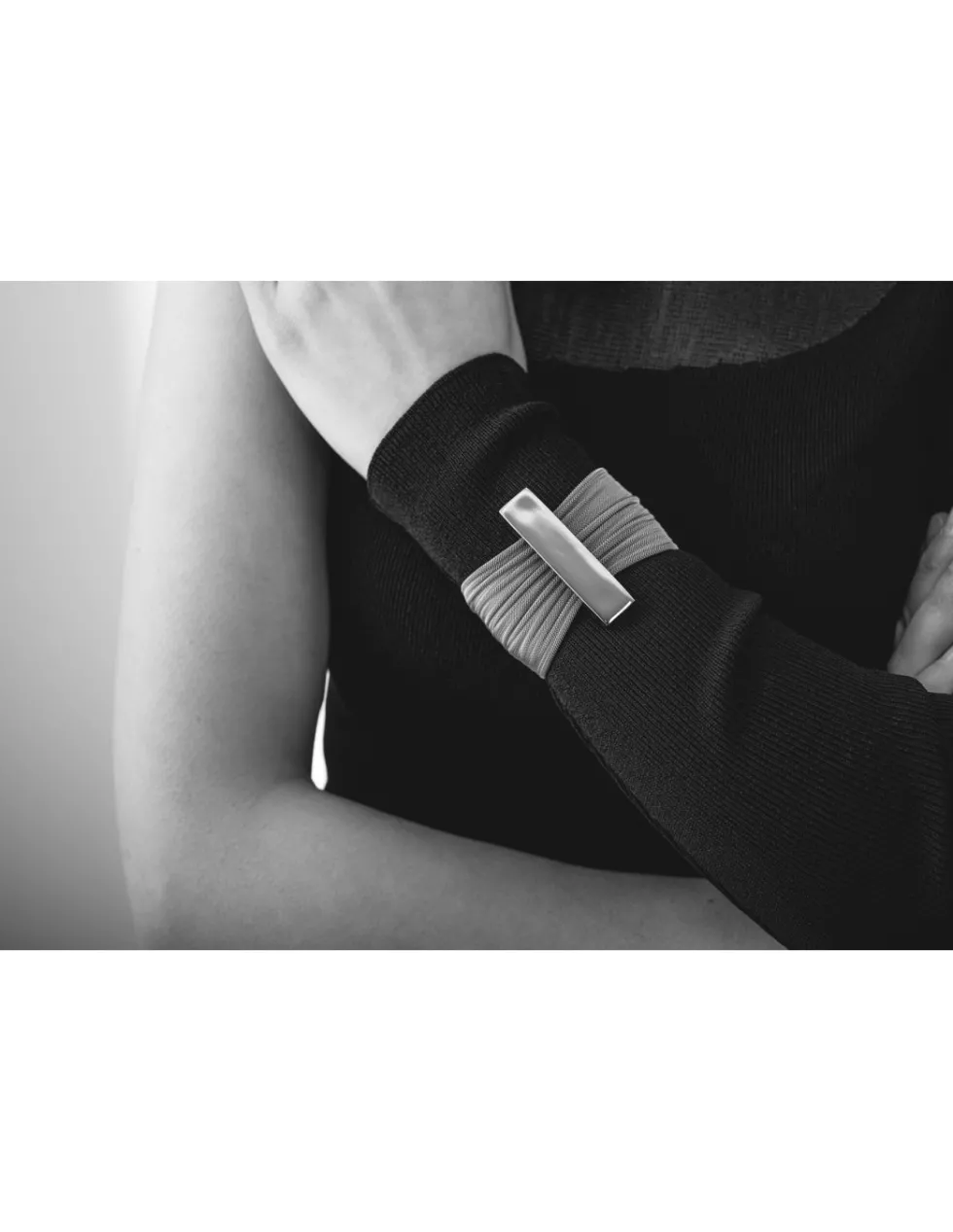 Ręcznie wykonana szeroka, prosta i ponadczasowa bransoleta z siatki oraz błyszczącej stali.