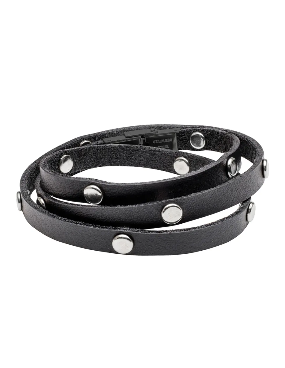 Prosta i ponadczasowa bransoleta skórzana oplatana na trzy razy. Ozdobne napy dopełniają całą bransoletę.