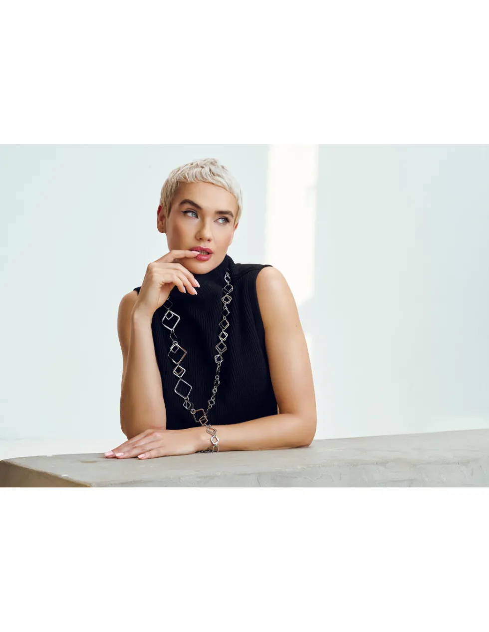 Piękny i ponadczasowy naszyjnik z ruchomymi elementami ze stali szlachetnej.