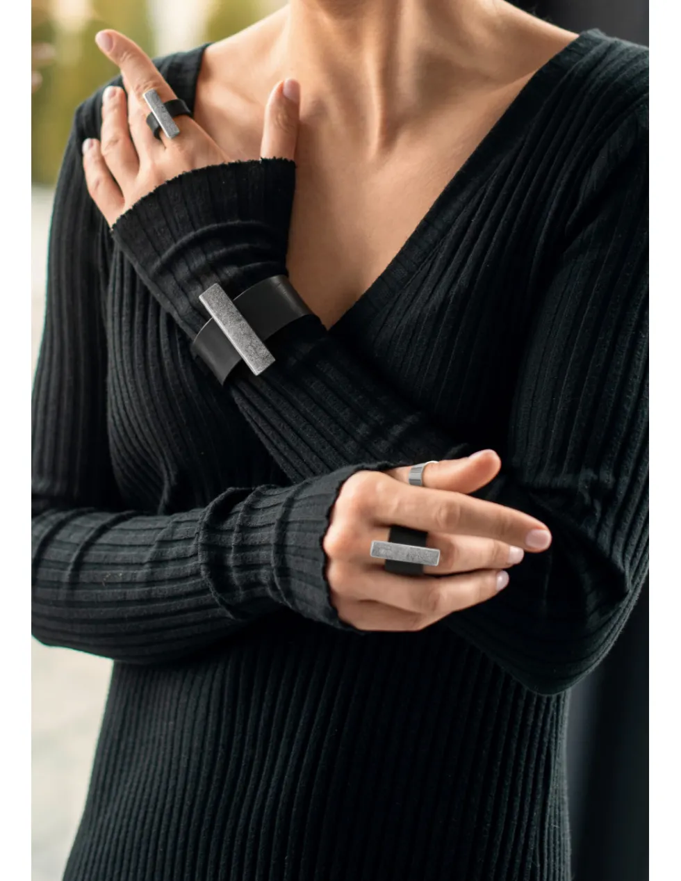 Nowoczesny, szeroki pierścionek wykonany ze skóry. Produkt stanowi idealne połączenie skóry oraz stali.