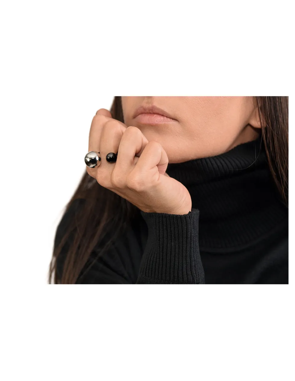 Minimalistyczny, prosty, nowoczesny pierścionek ze stali szlachetnej z dwoma ozdobnymi kulami w czarnym i srebrnym kolorze.
