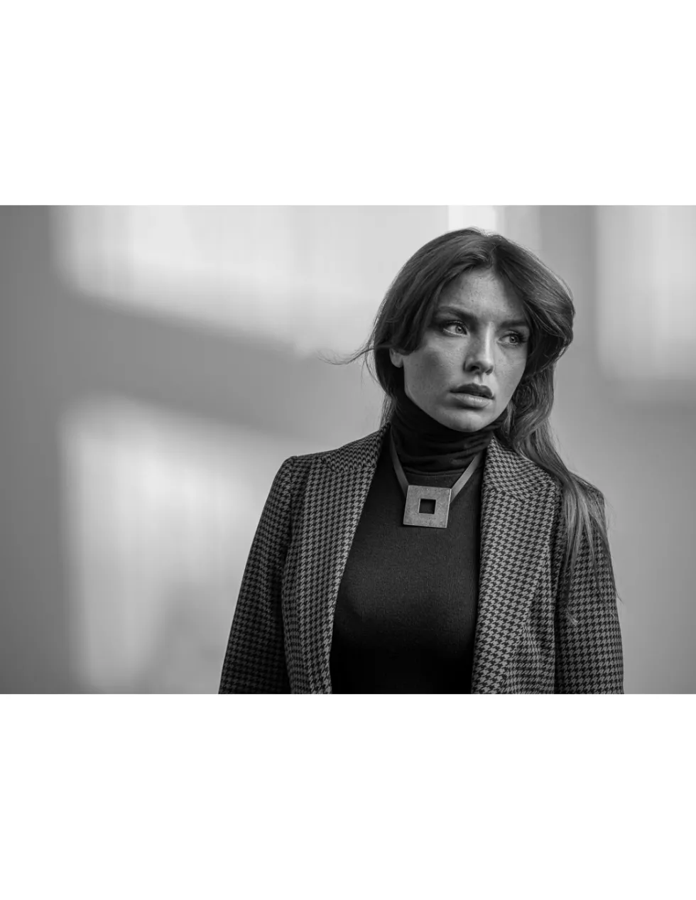 Prosty i nowoczesny naszyjnik ze skóry oraz stali szlachetnej z dużym matowym elementem.