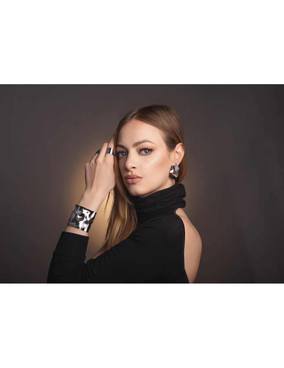 Pierścionek świetnie komponuje się z kolczykami oraz prostym chokerem o tym samym wzorze.